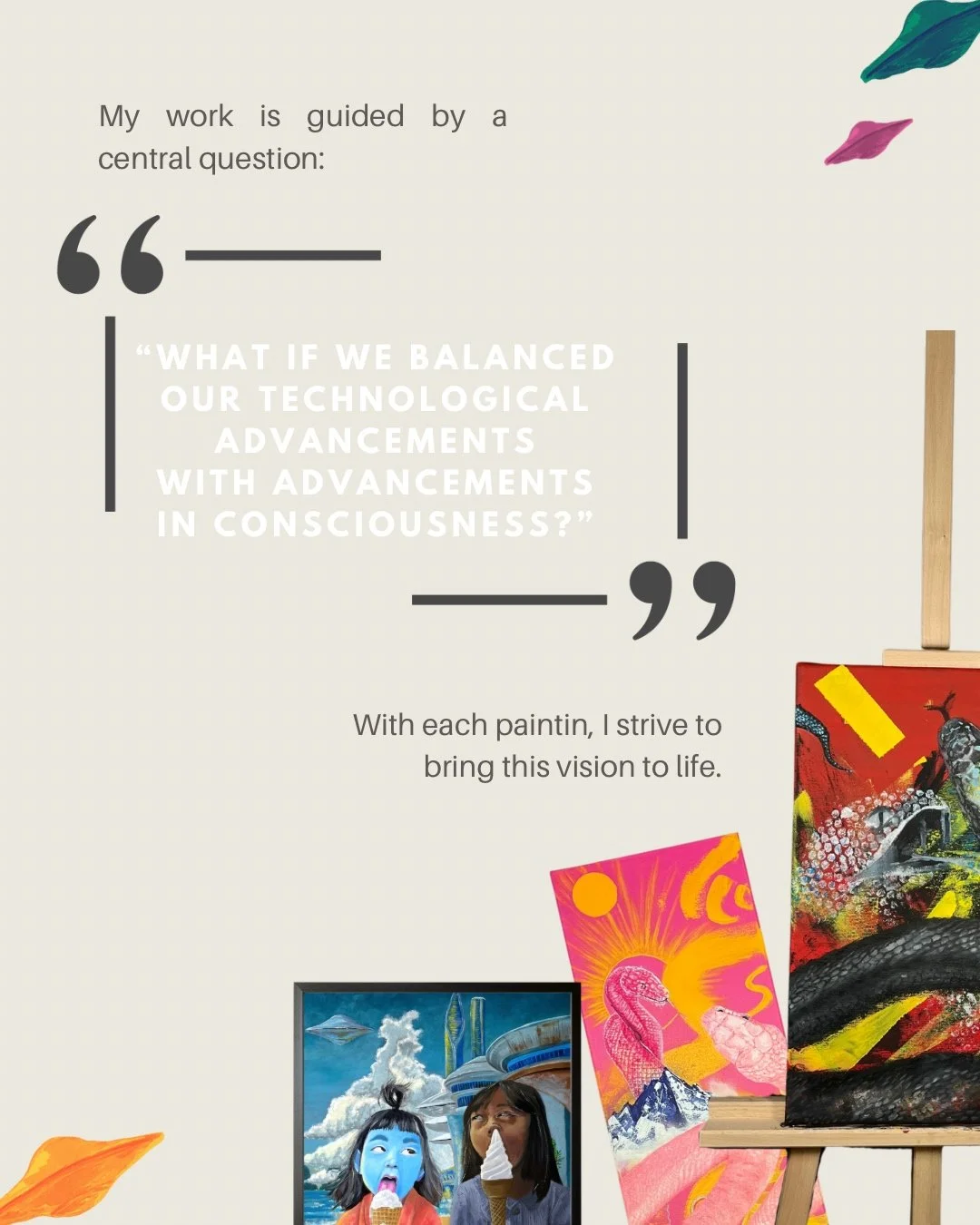 My work is guided by a central question: “What if we balanced our technological advancements with advancements in consciousness?” With each painting, I strive to bring this vision to life.