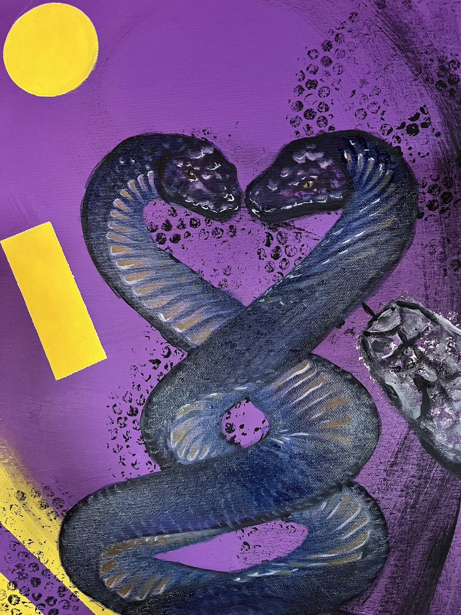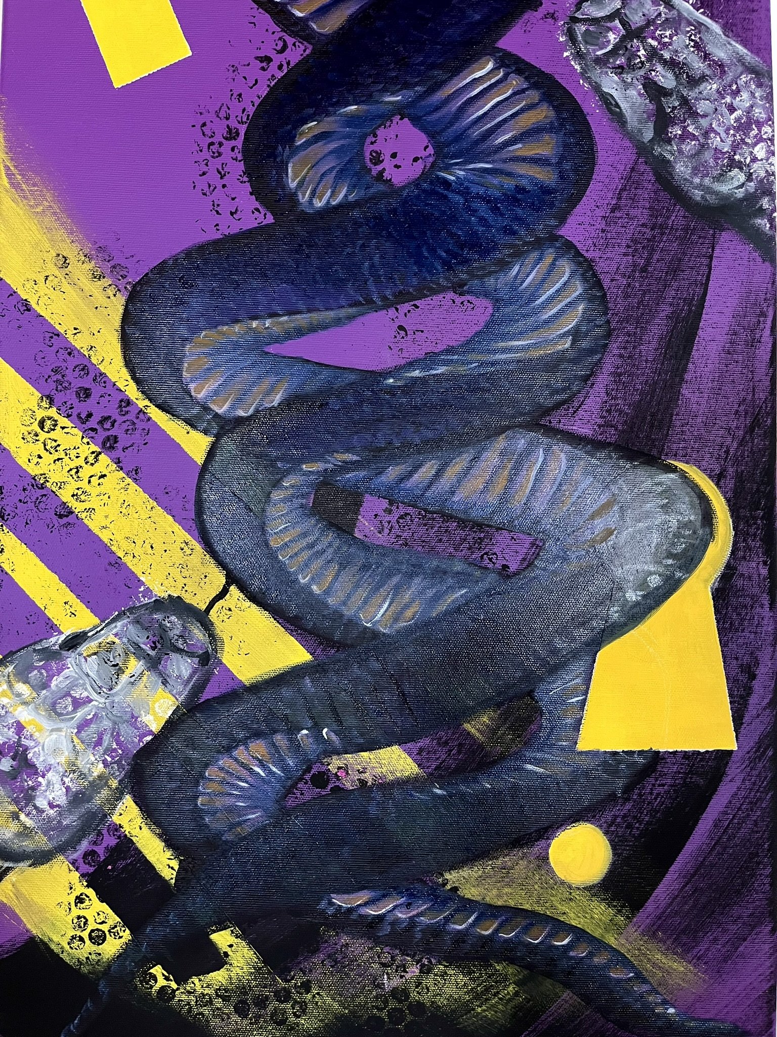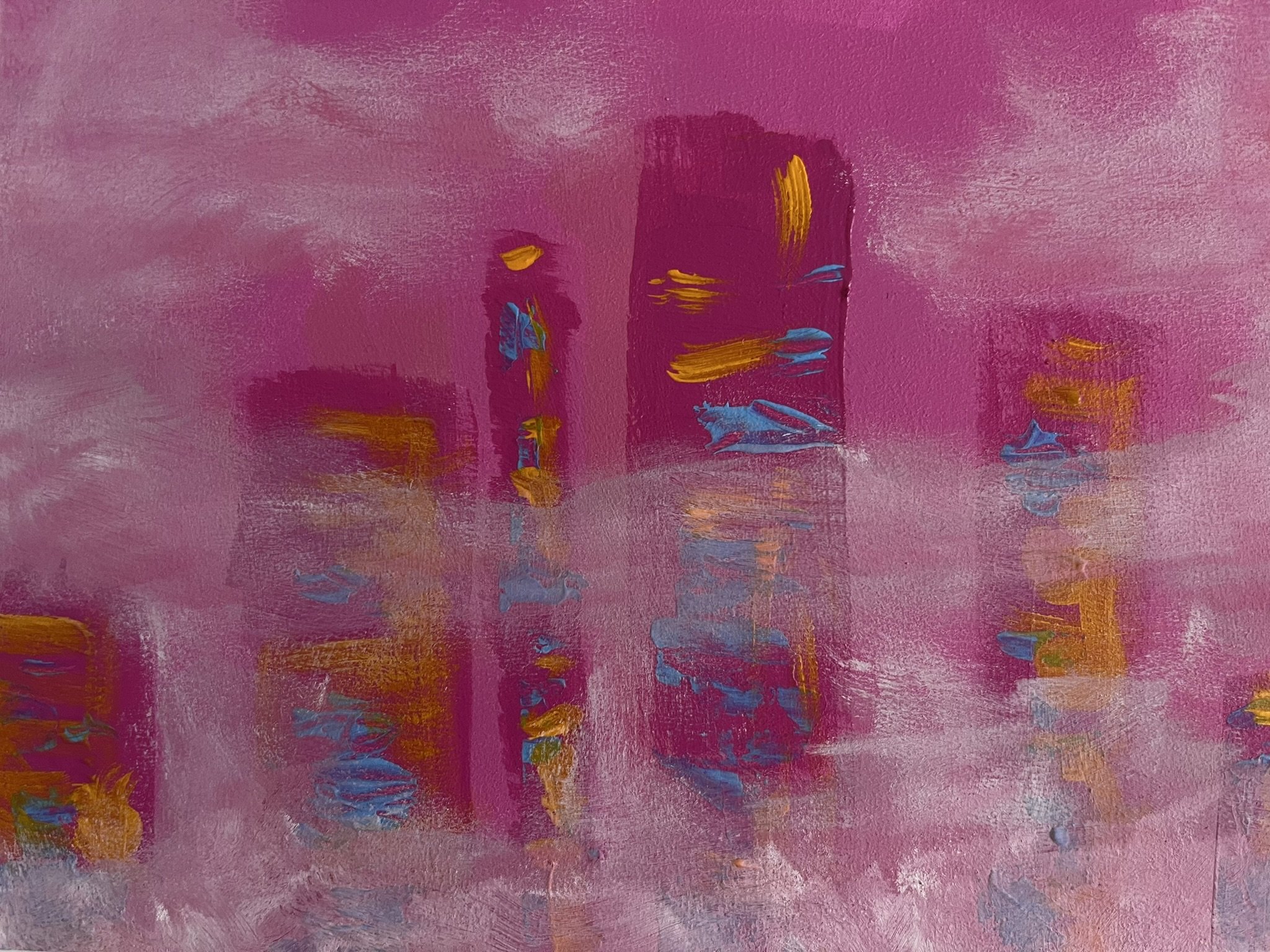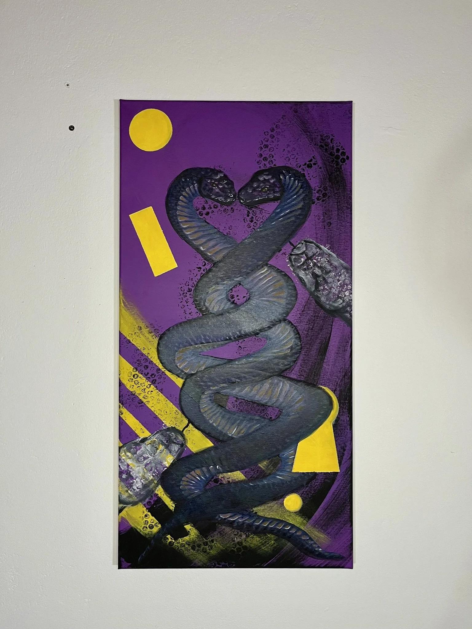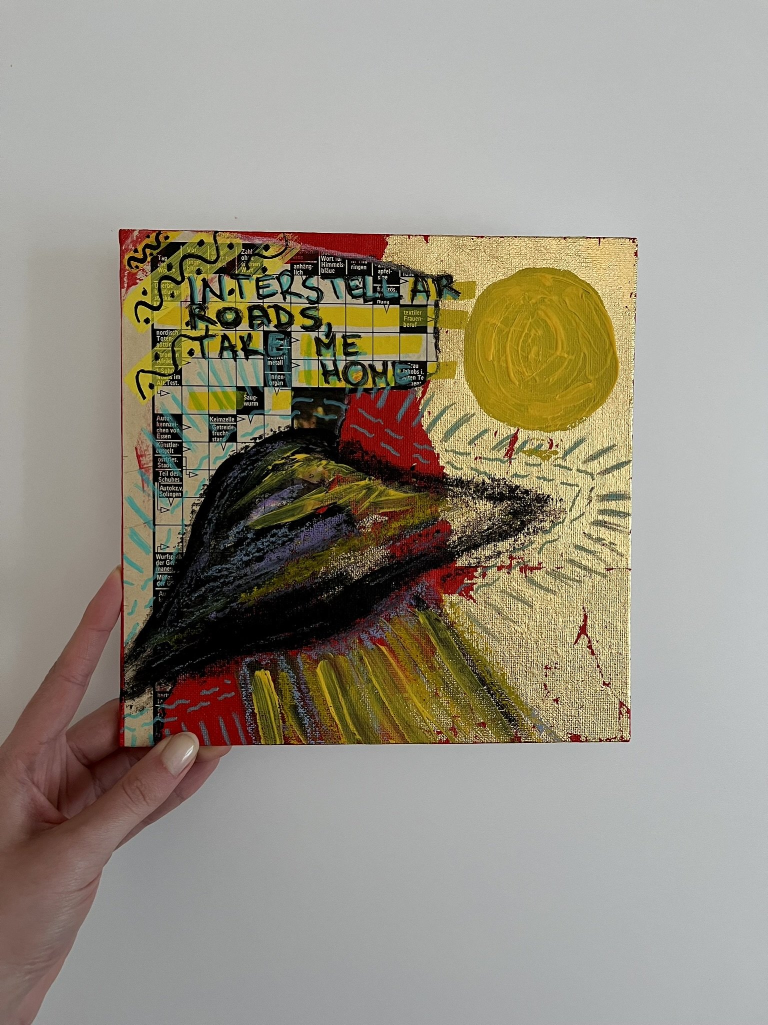 I mainly use oils and acrylics, alongside with pastels, sprays, foils and structured pastes to create colour rich and saturated pieces