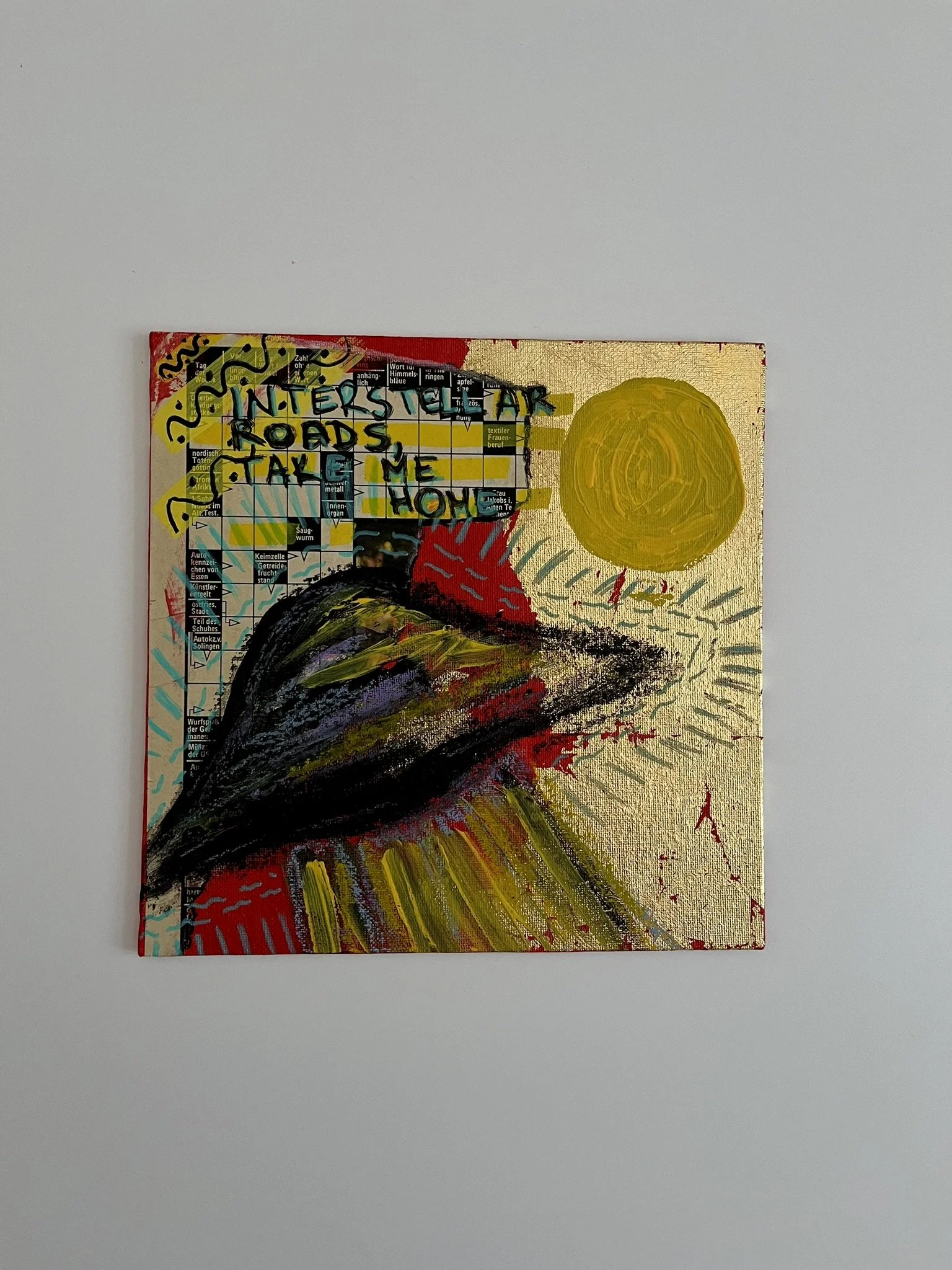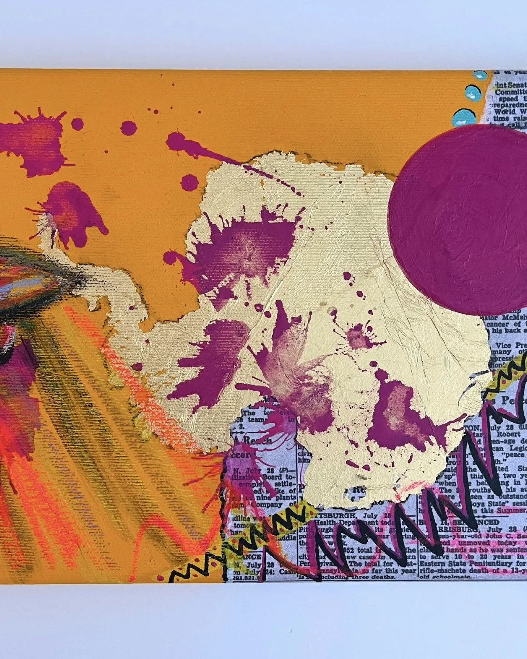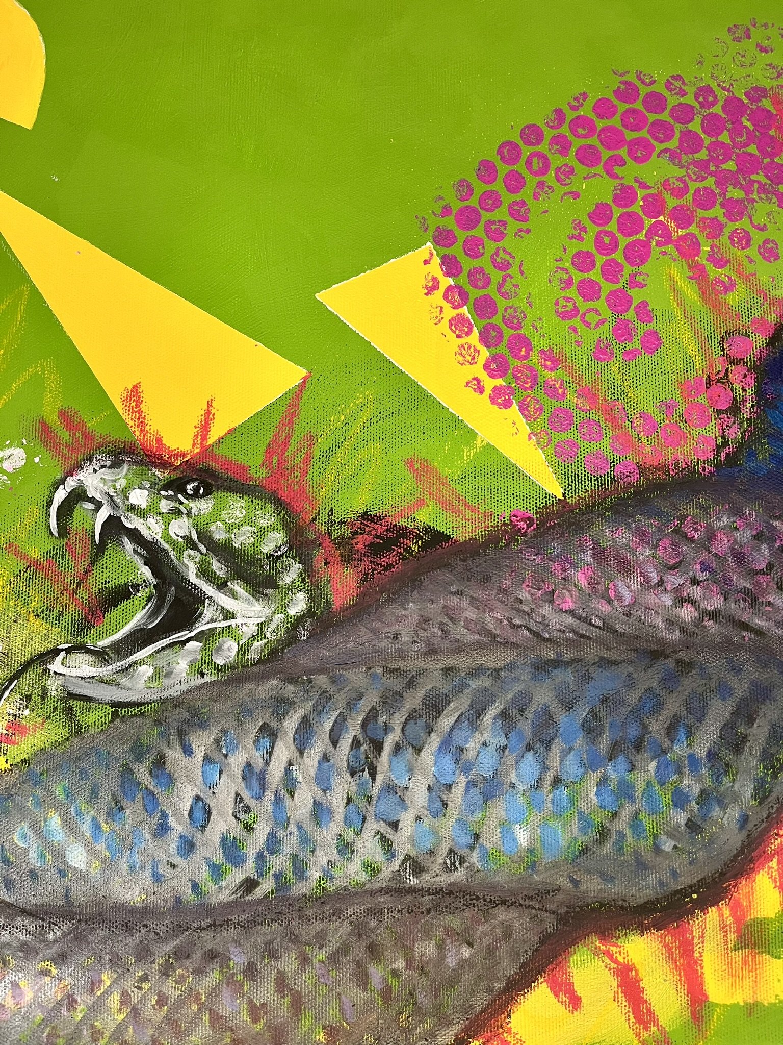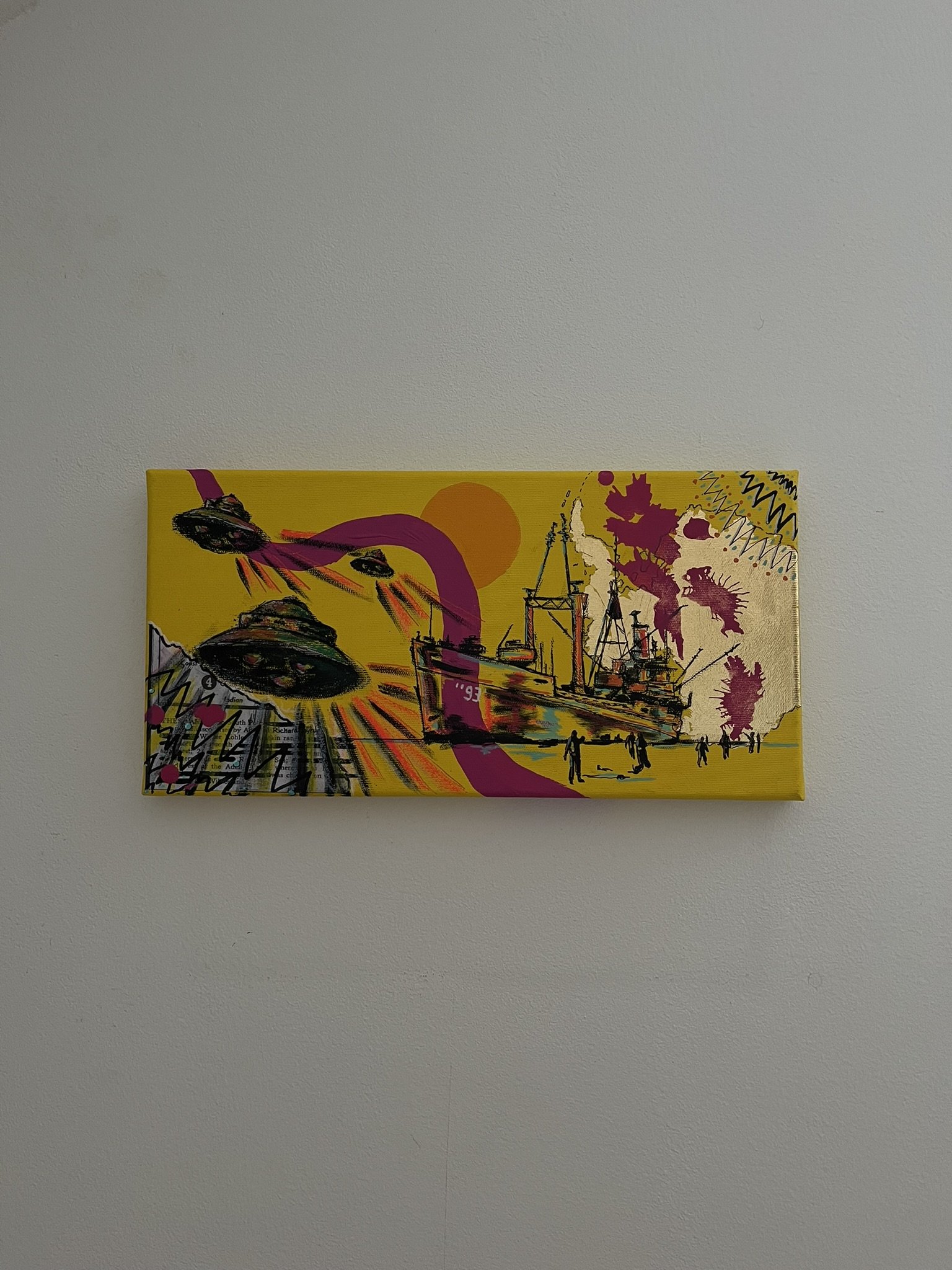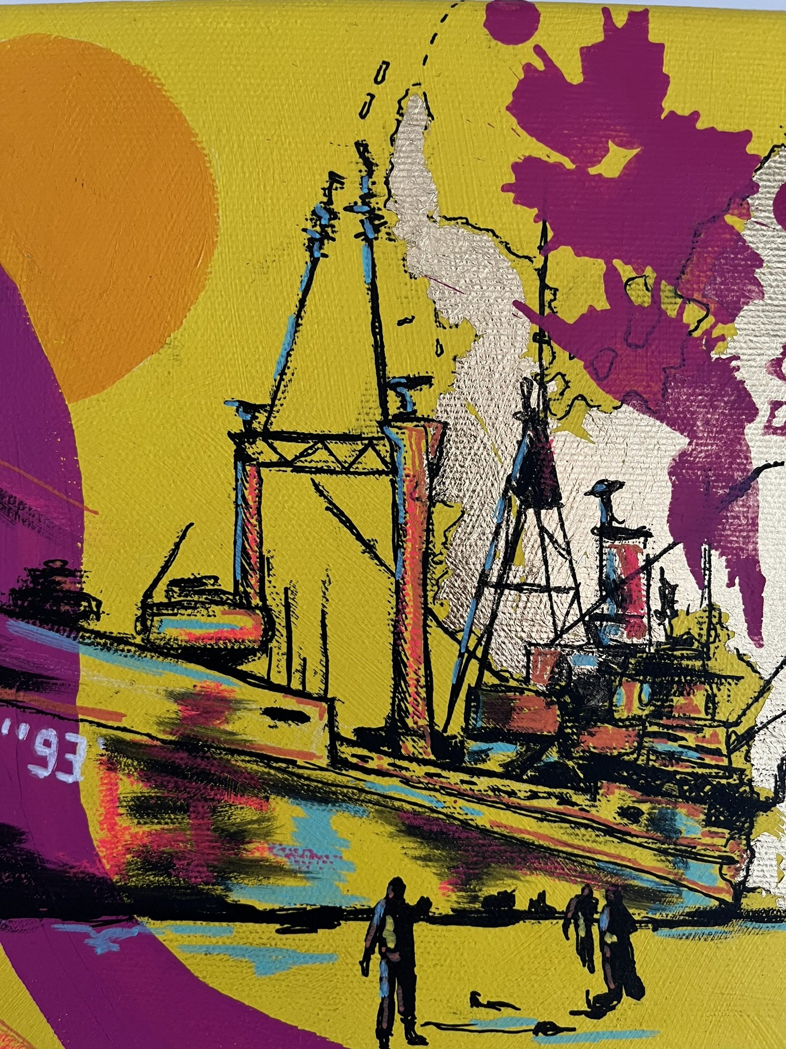 I mainly use oils and acrylics, alongside with pastels, sprays, foils and structured pastes to create colour rich and saturated pieces