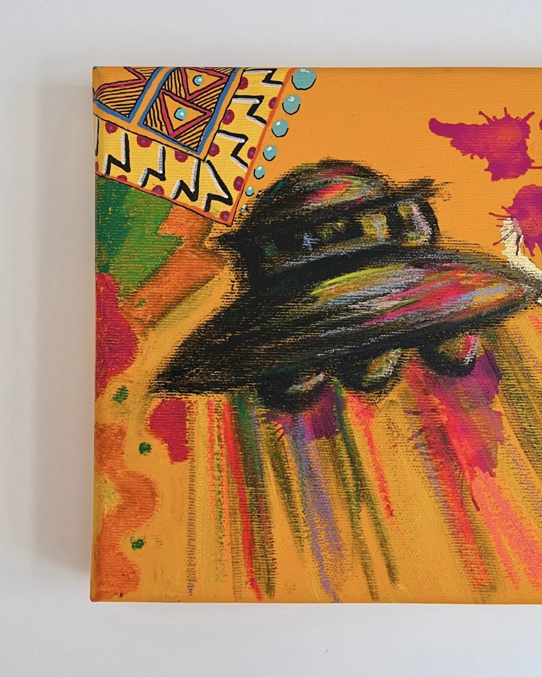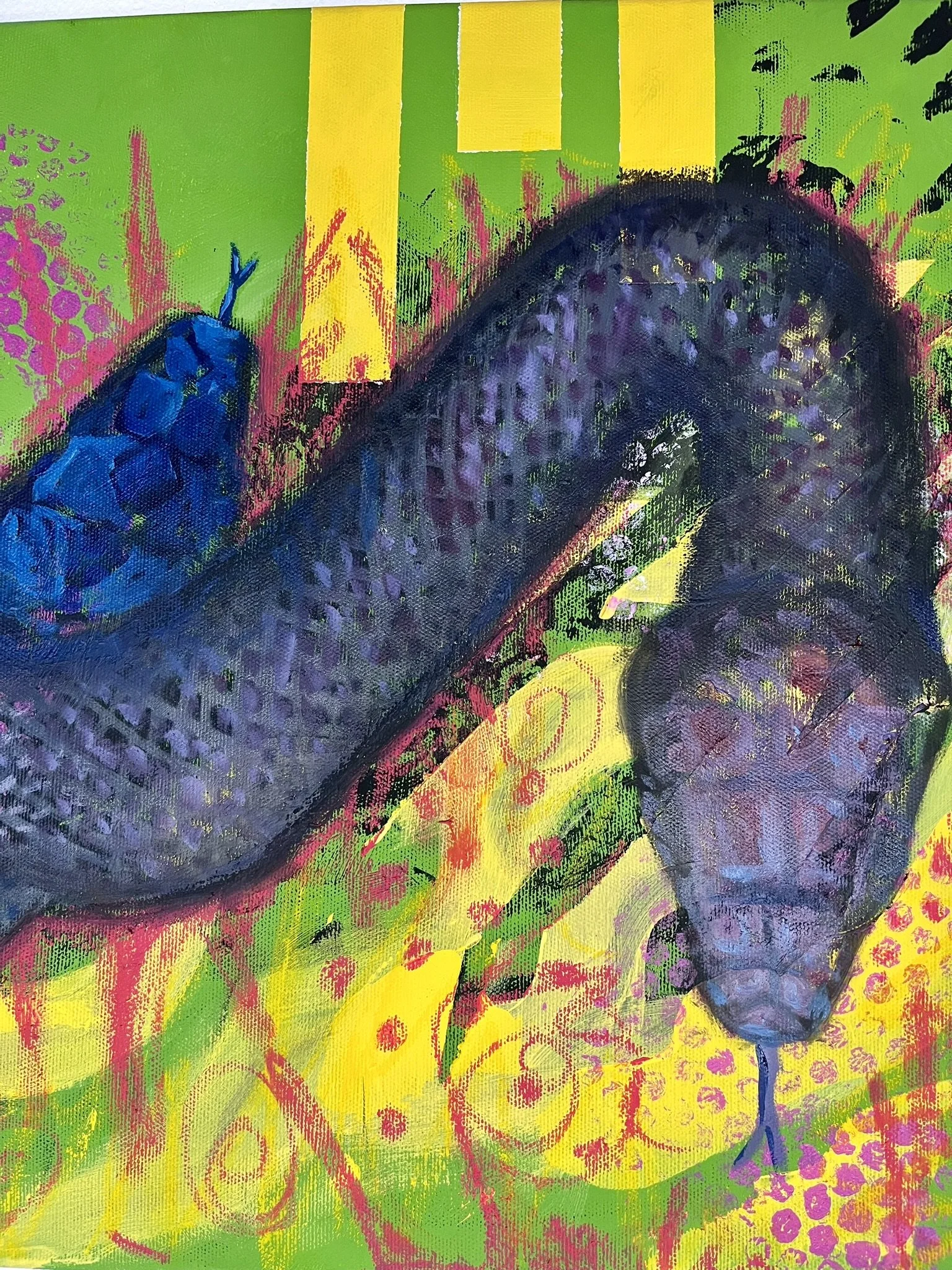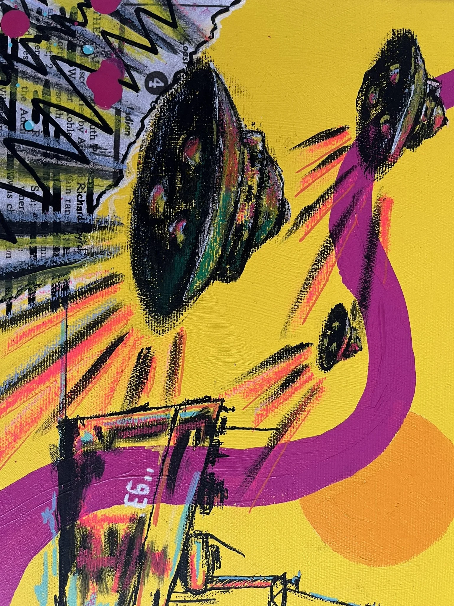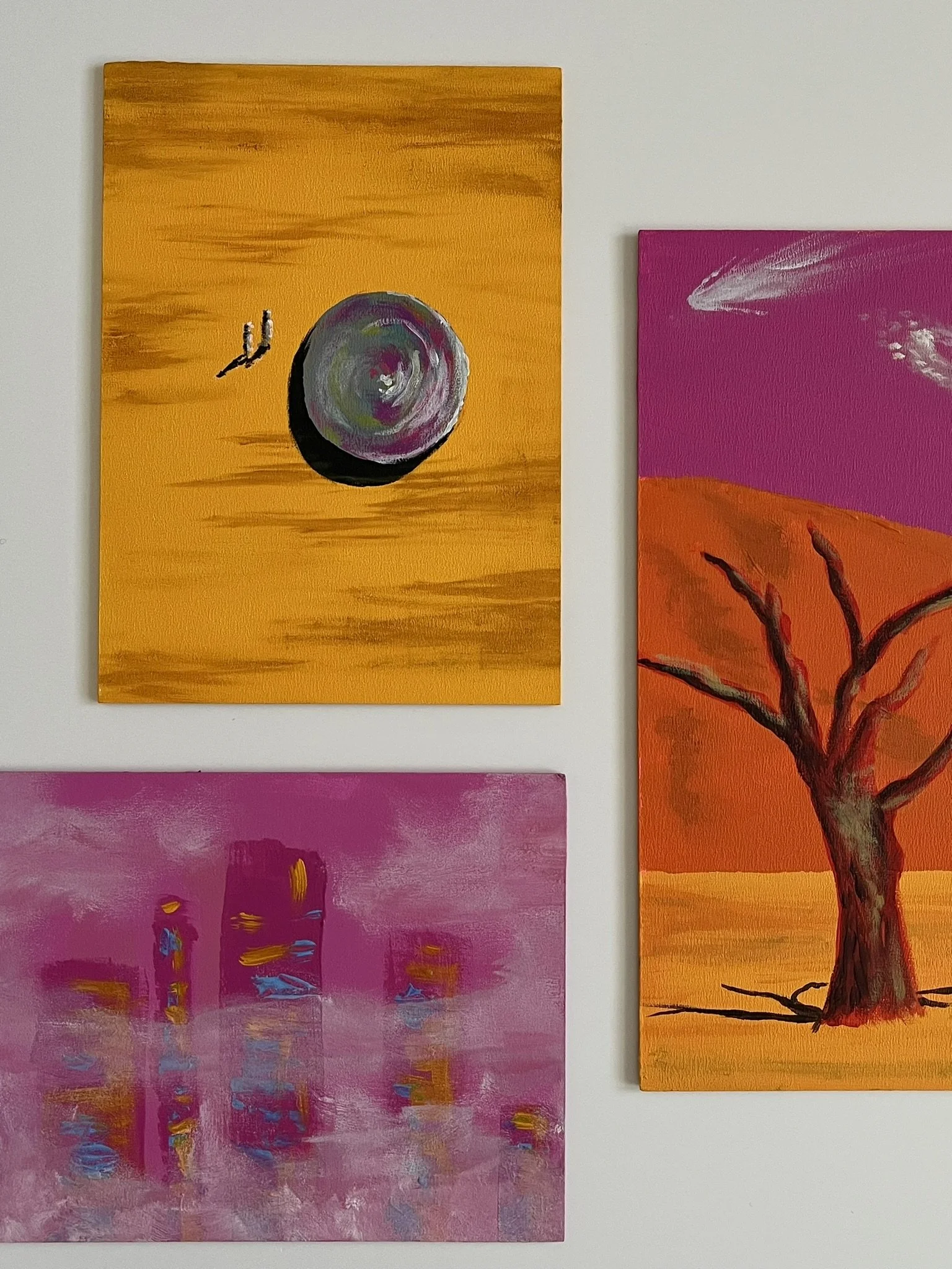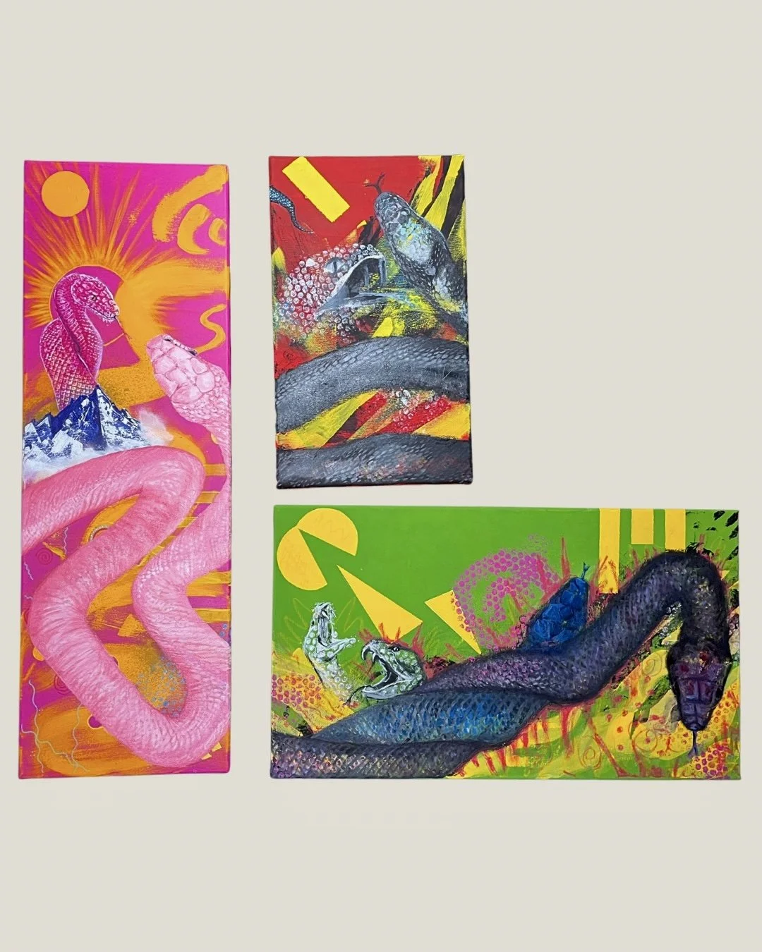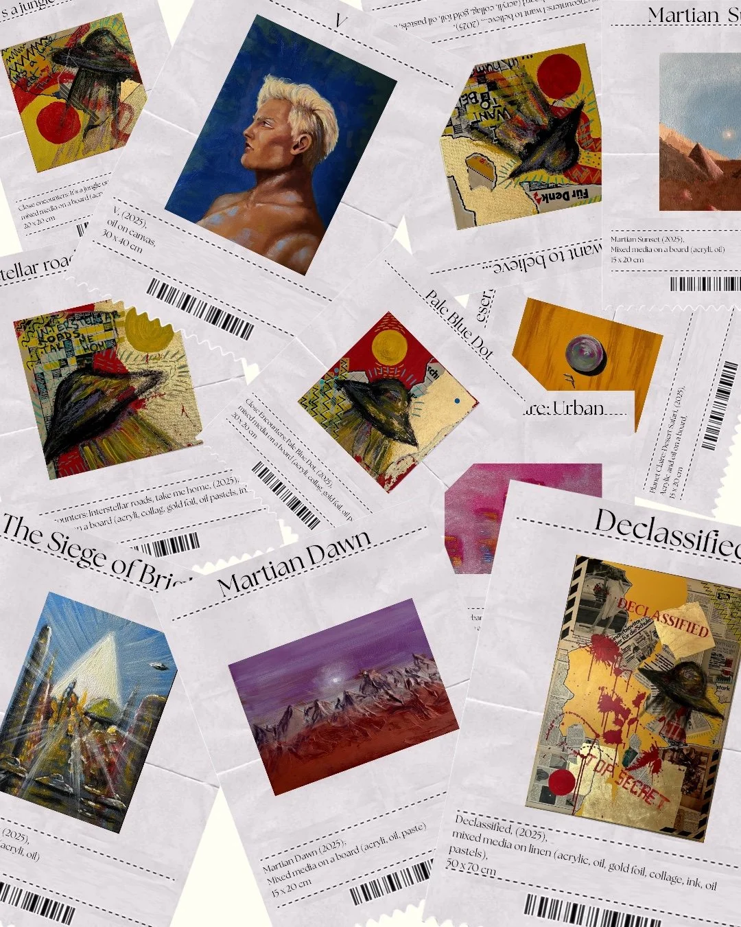 I mainly use oils and acrylics, alongside with pastels, sprays, foils and structured pastes to create colour rich and saturated pieces