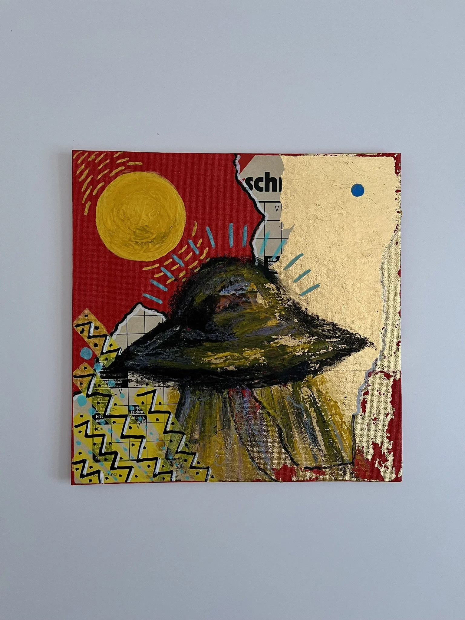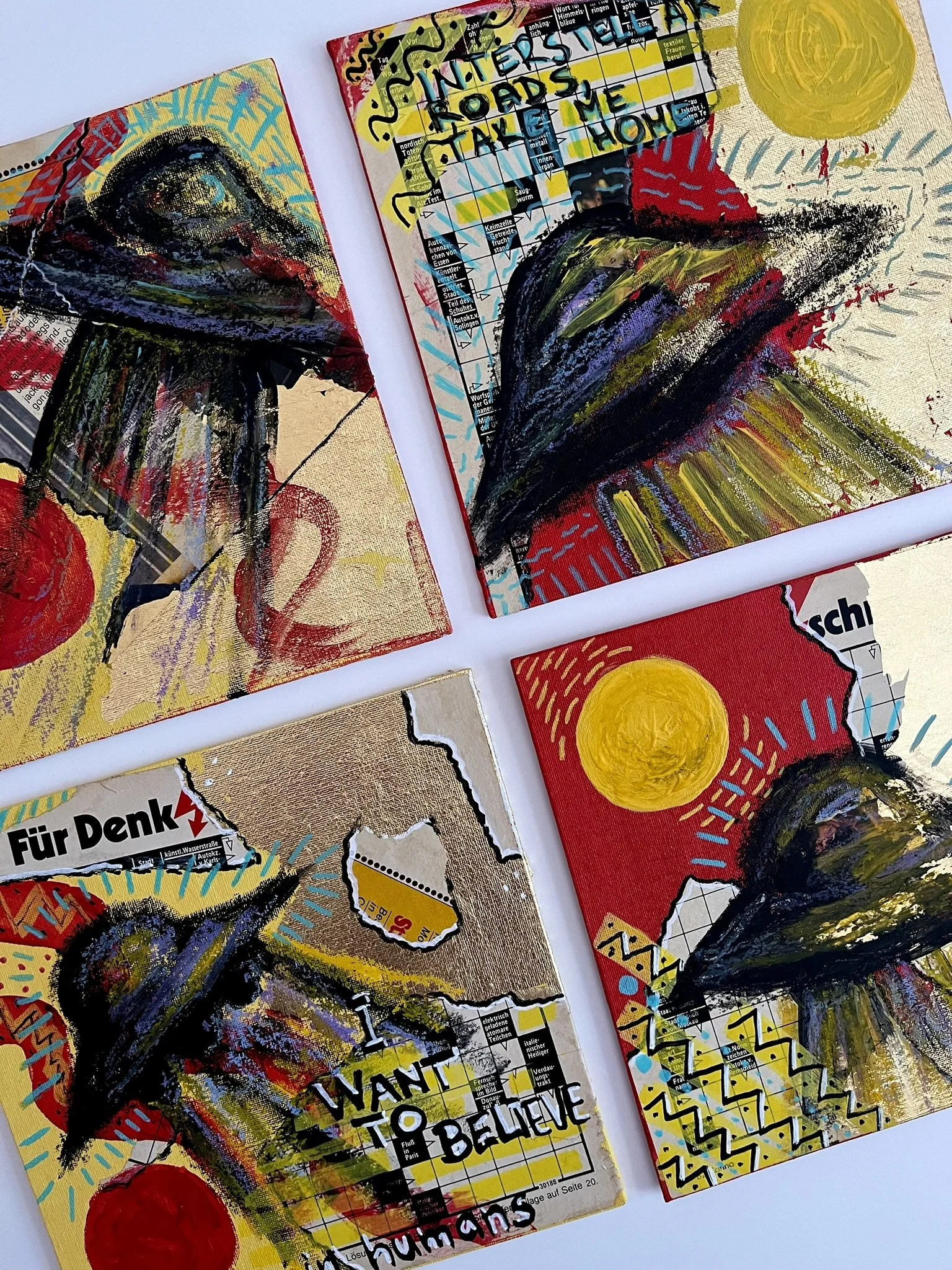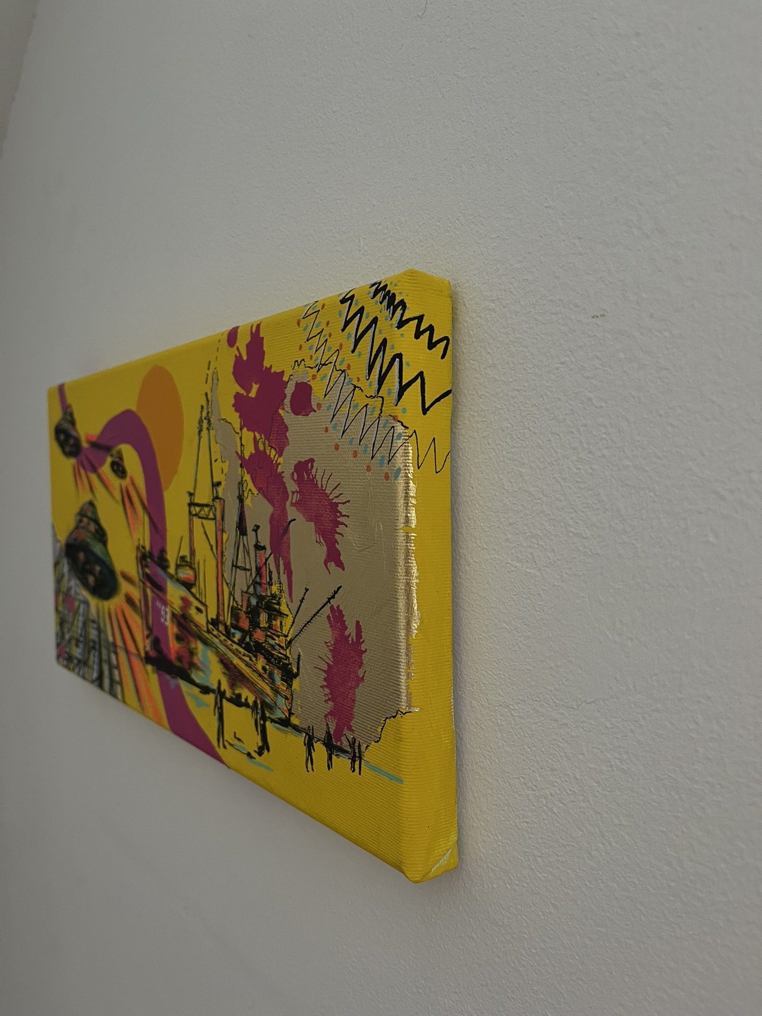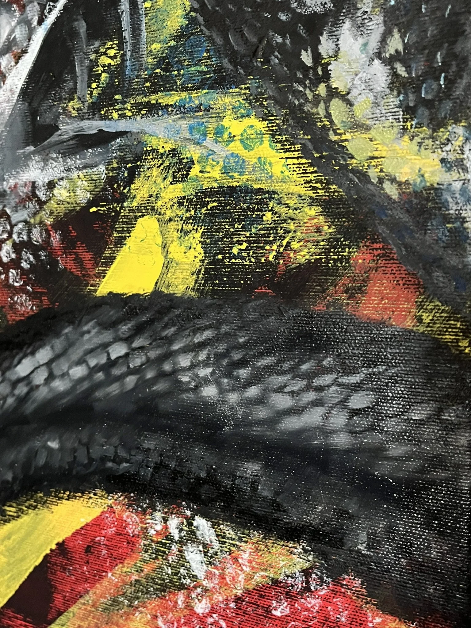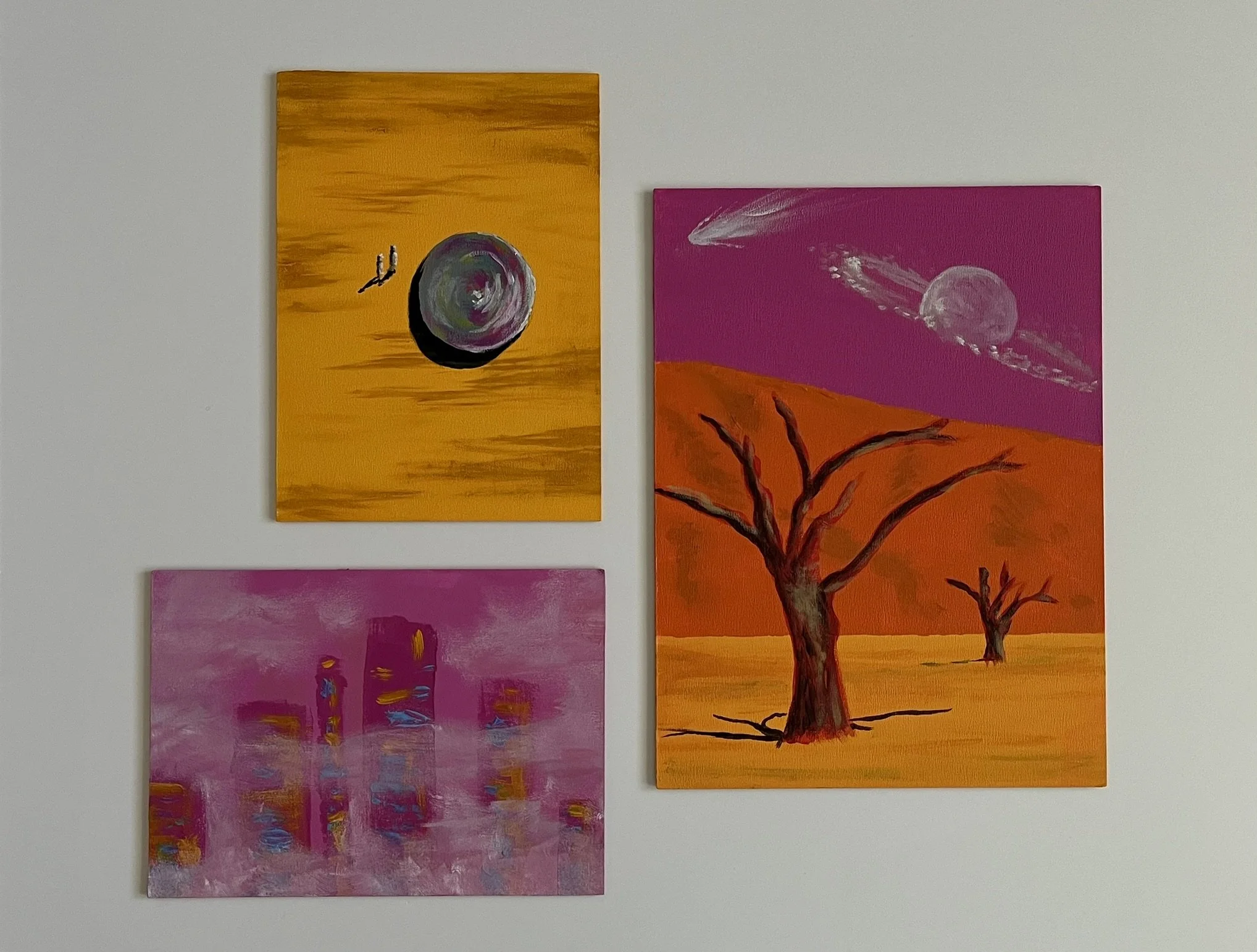 I mainly use oils and acrylics, alongside with pastels, sprays, foils and structured pastes to create colour rich and saturated pieces