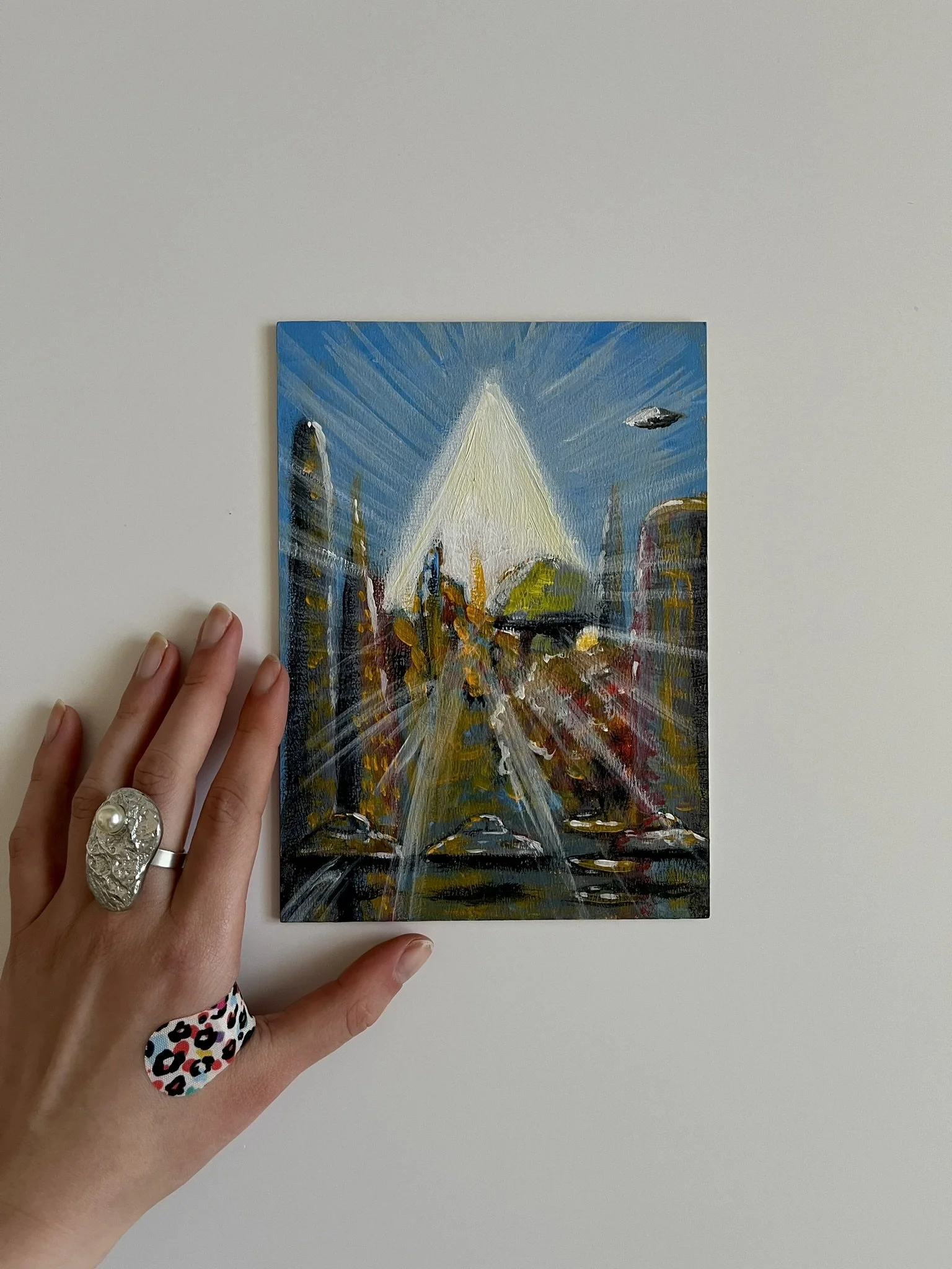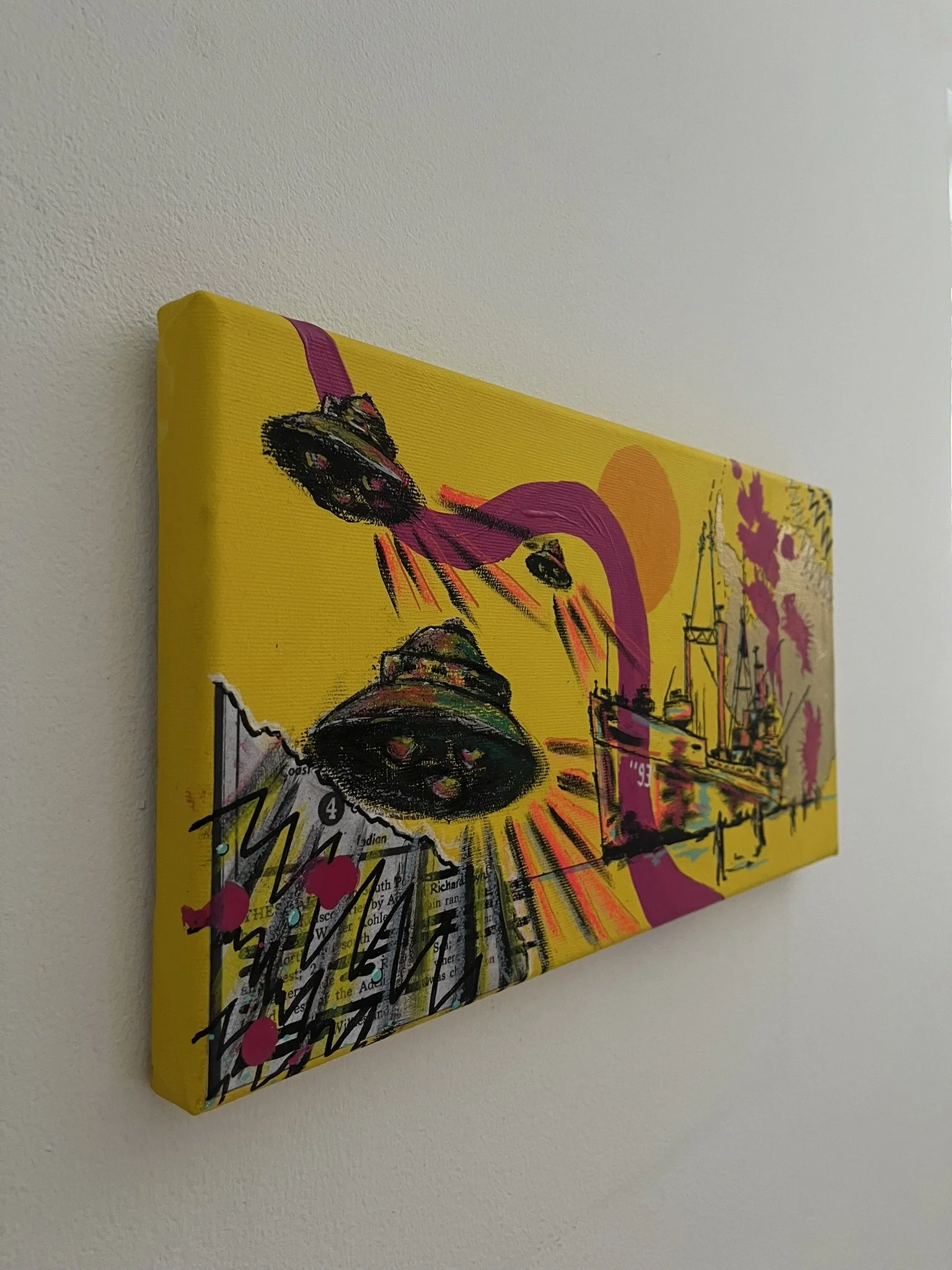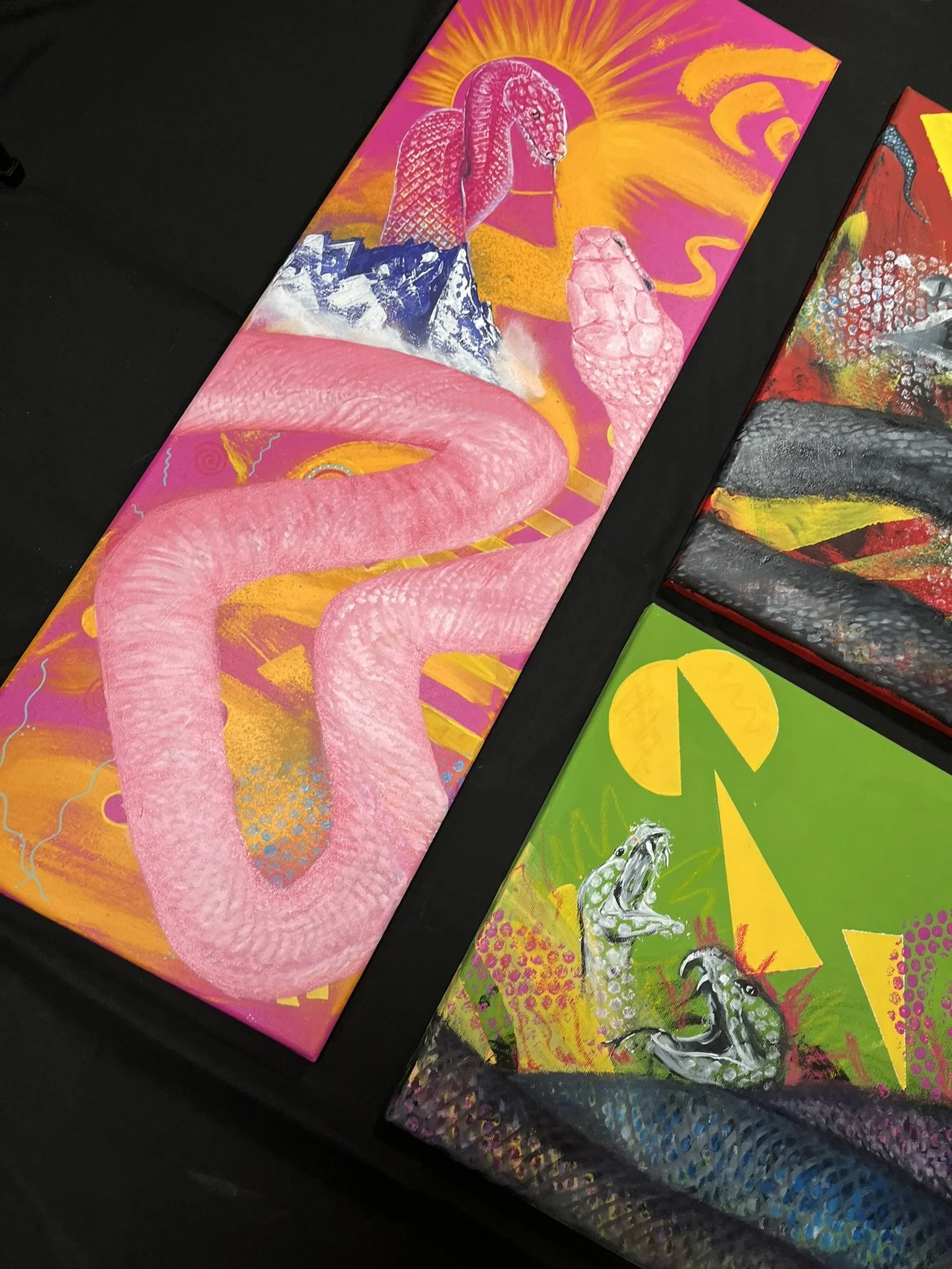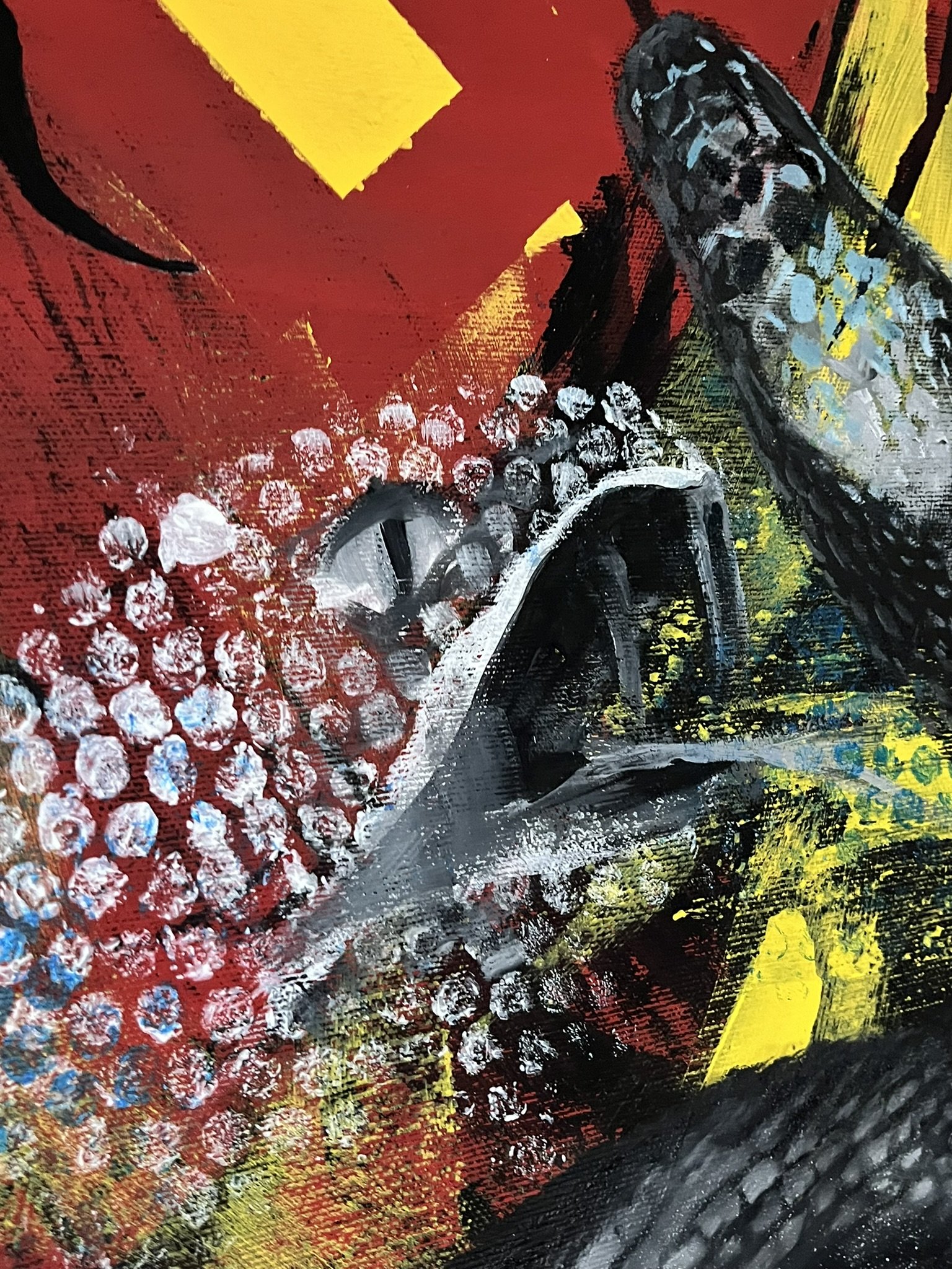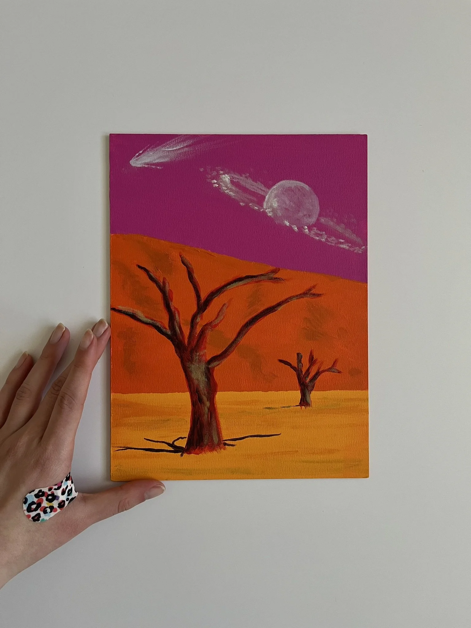 I mainly use oils and acrylics, alongside with pastels, sprays, foils and structured pastes to create colour rich and saturated pieces