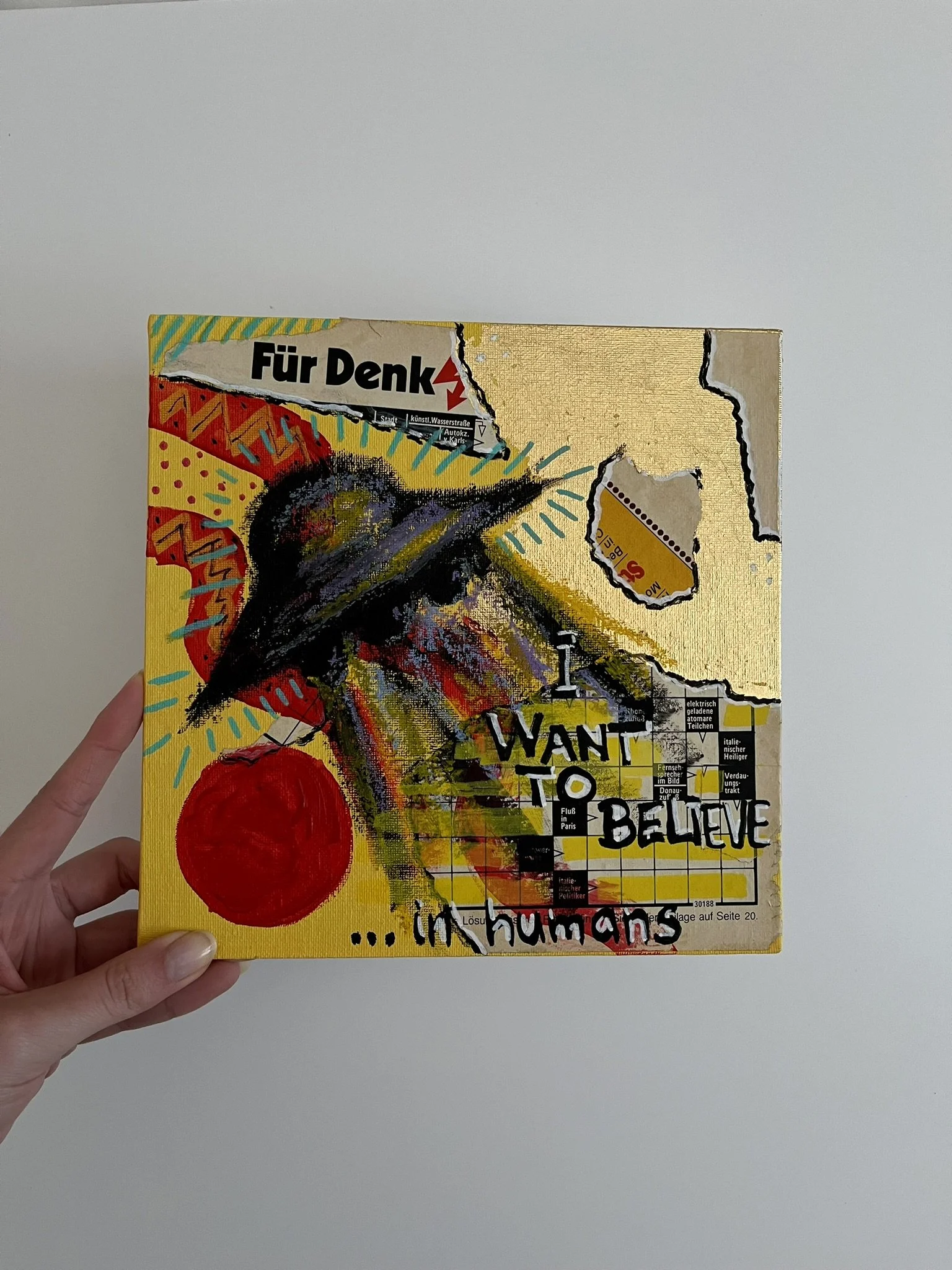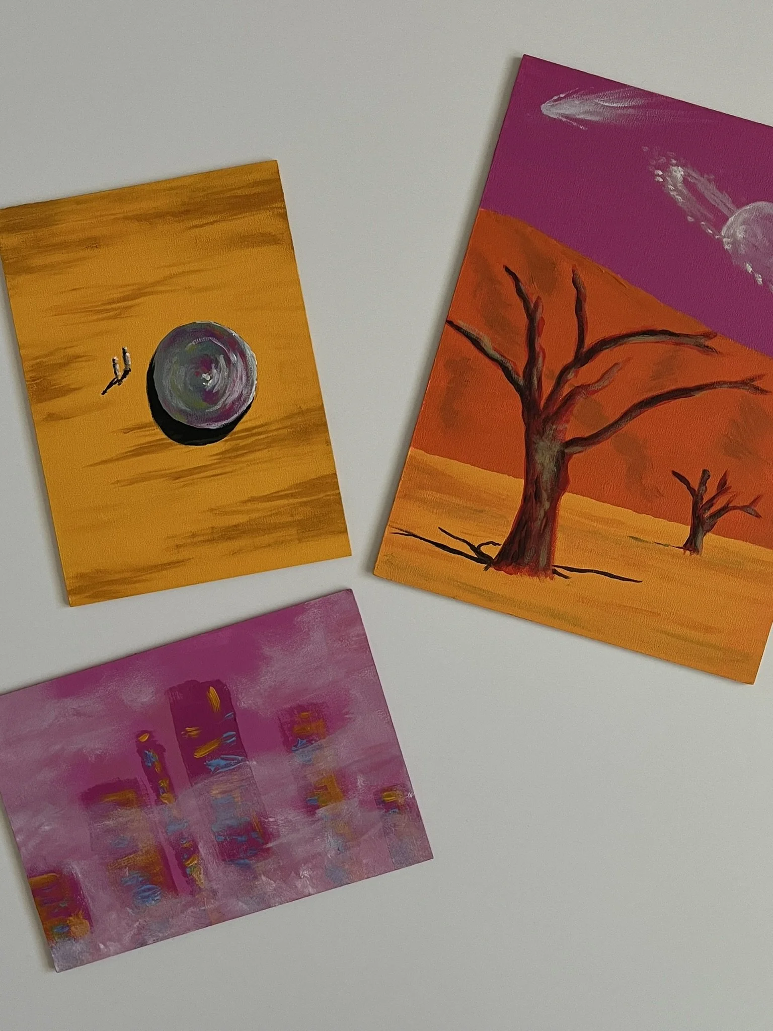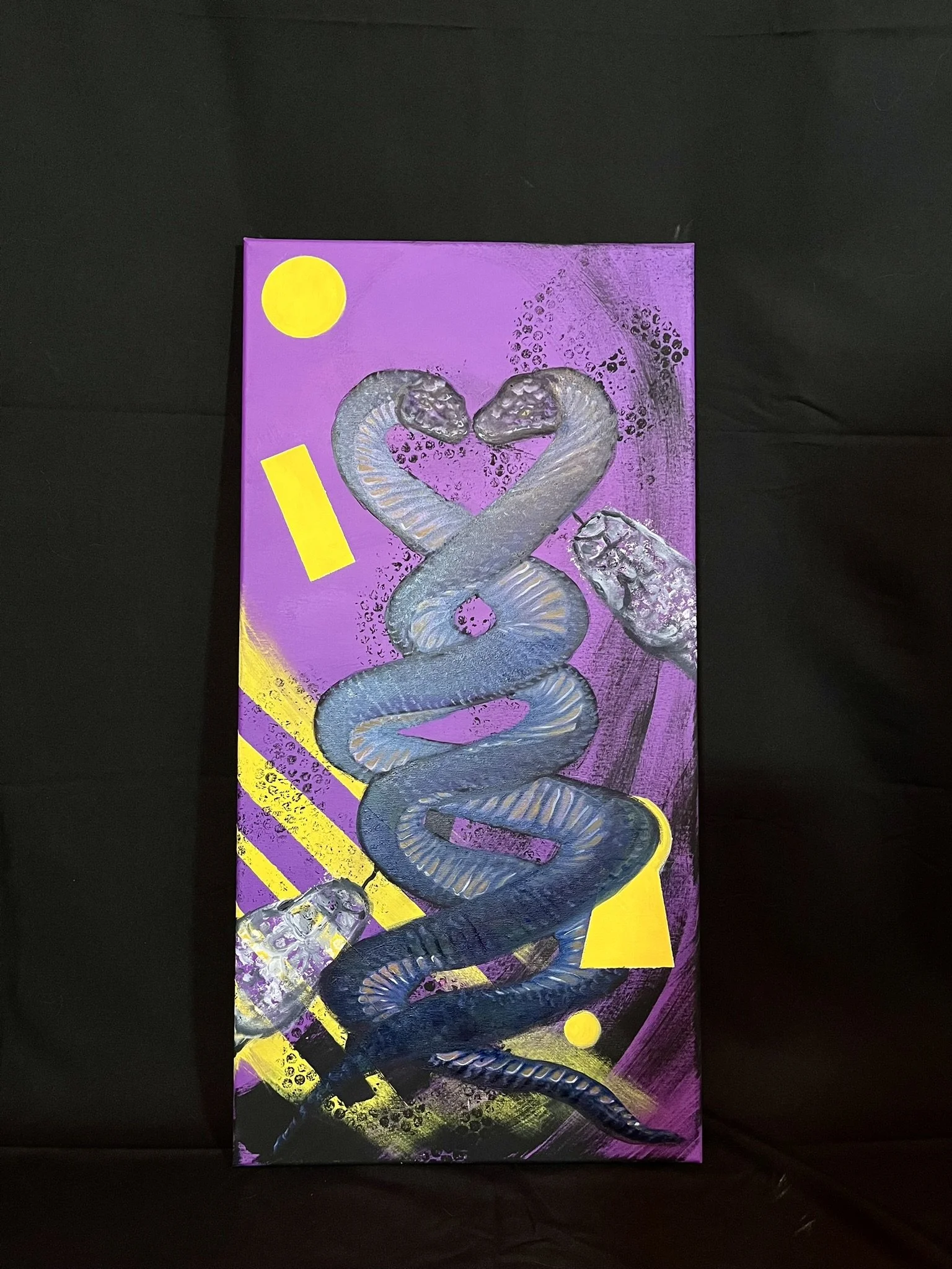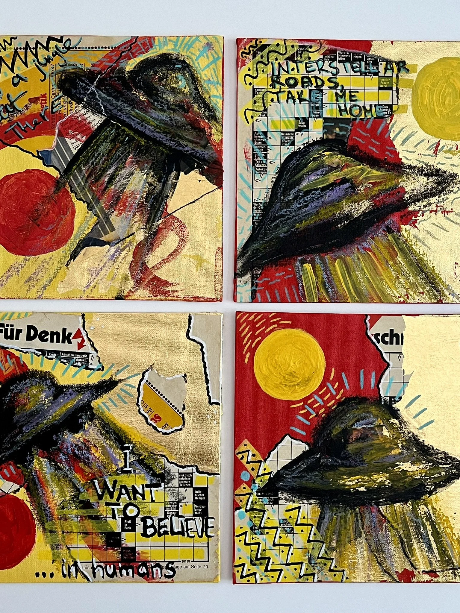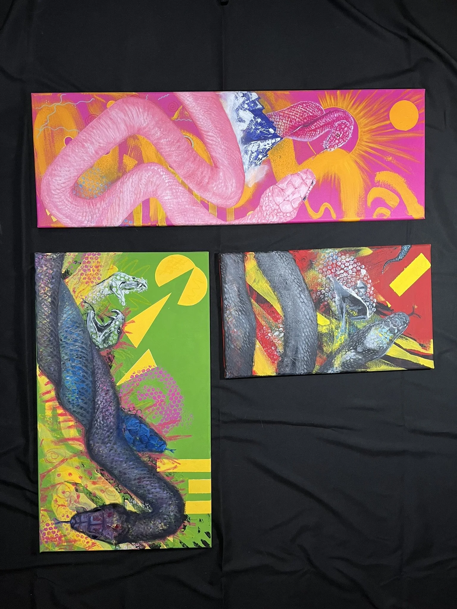 I mainly use oils and acrylics, alongside with pastels, sprays, foils and structured pastes to create colour rich and saturated pieces