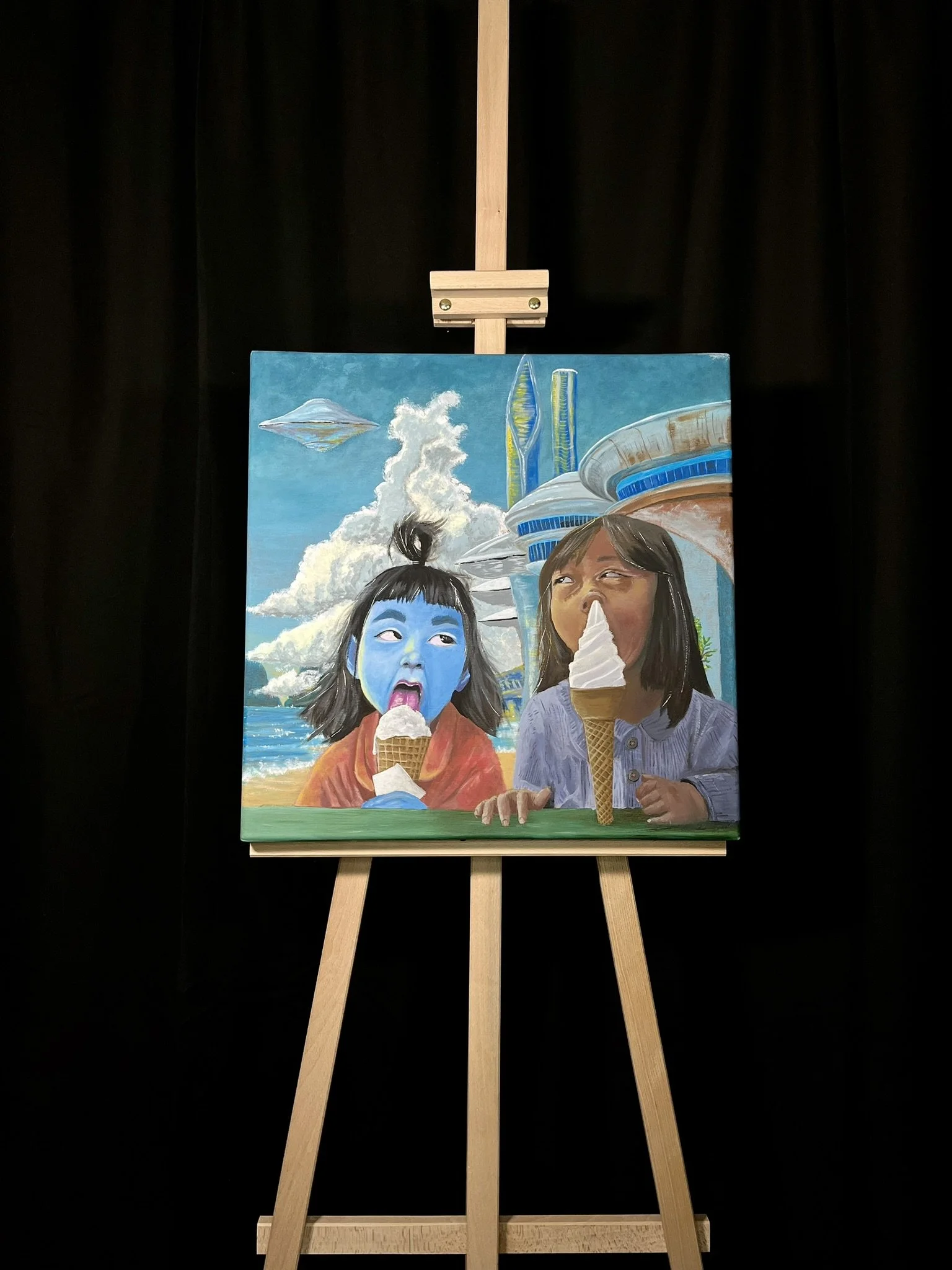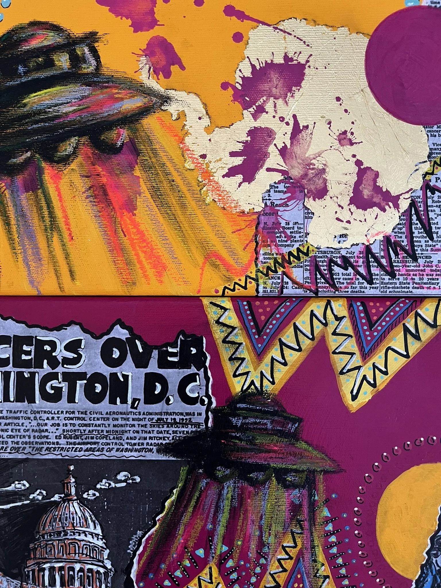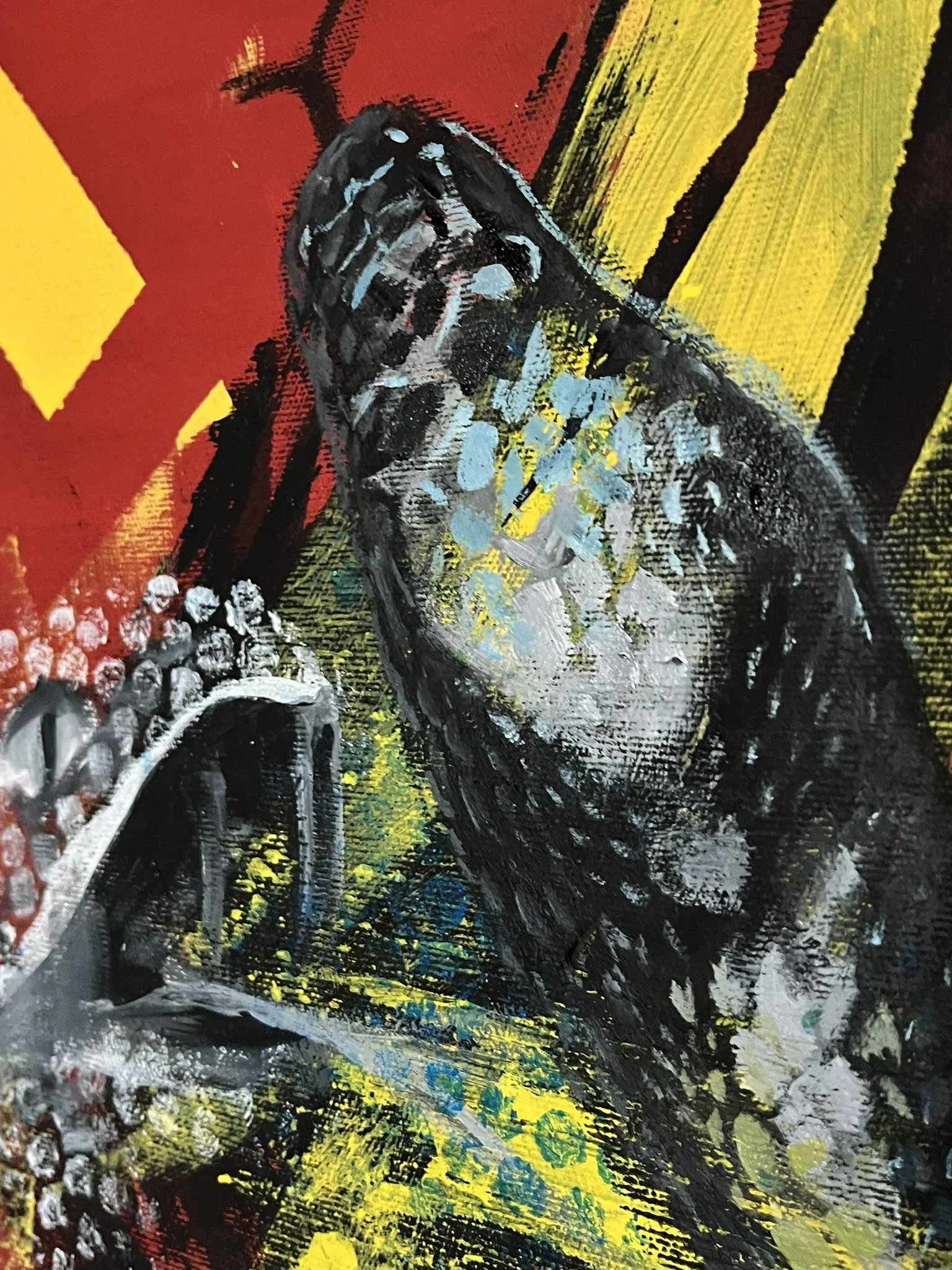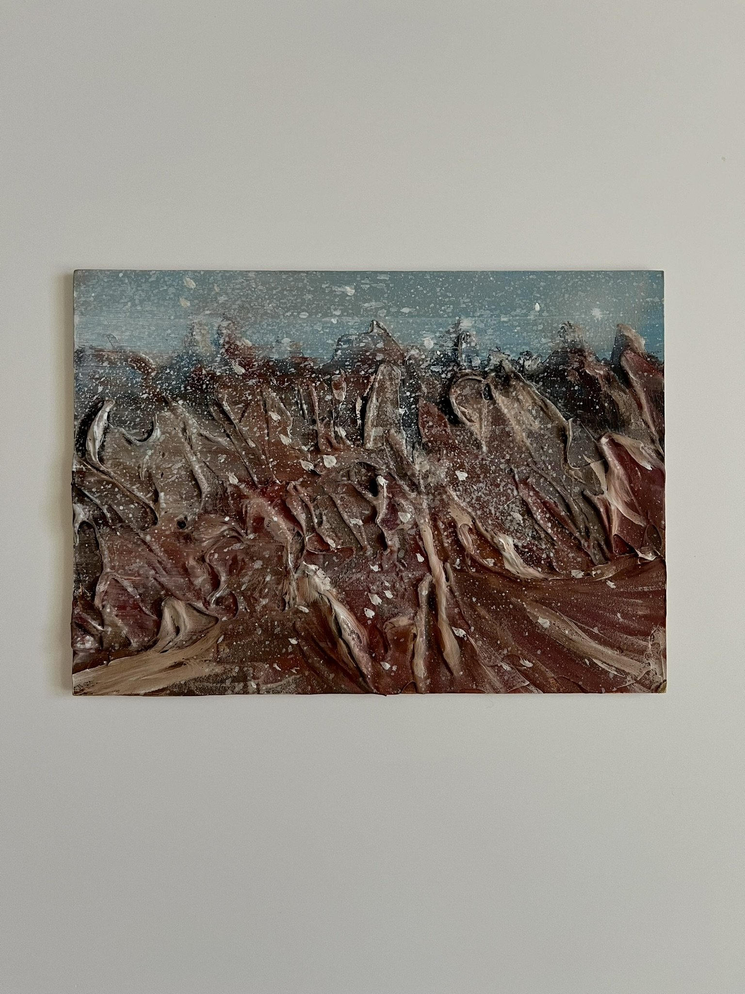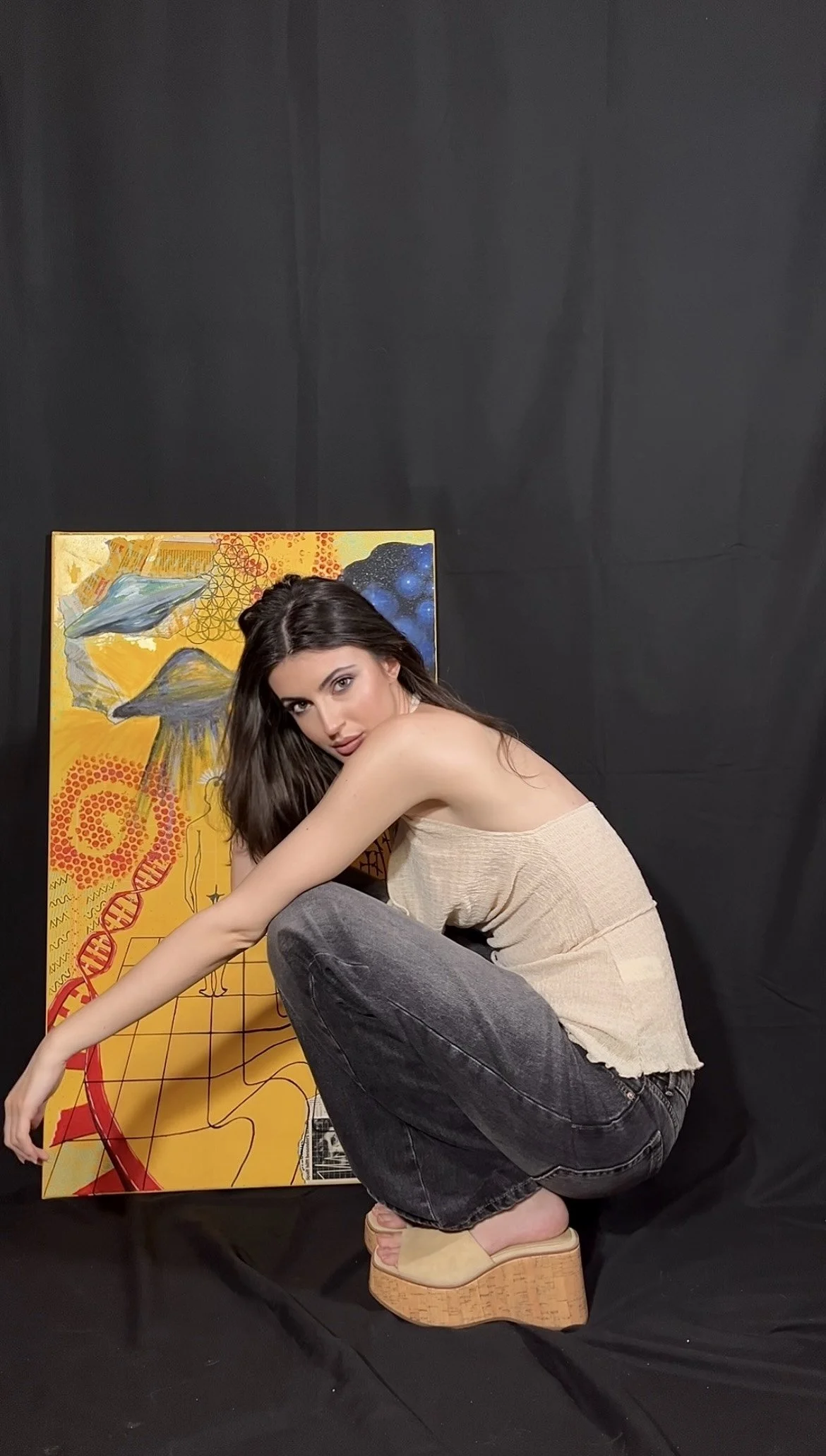 I mainly use oils and acrylics, alongside with pastels, sprays, foils and structured pastes to create colour rich and saturated pieces