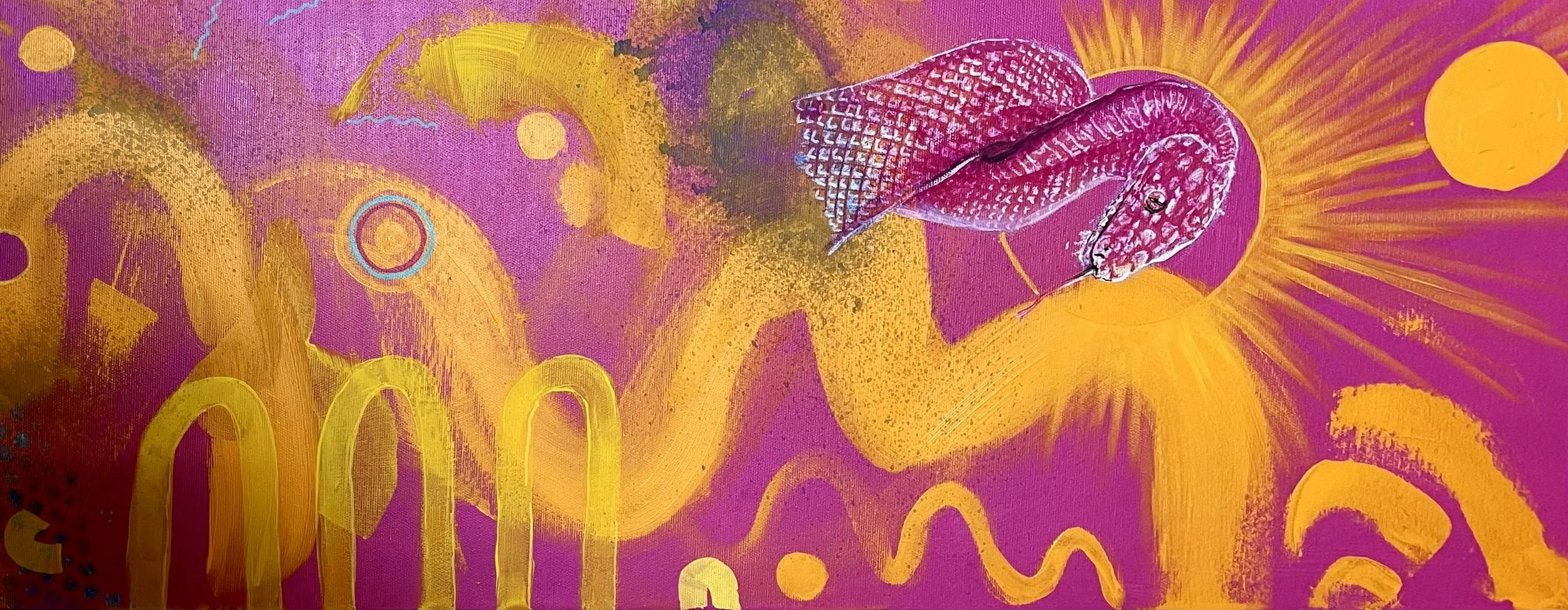 ‘Primordial Serpent: Feminine Principle’ is a second painting in the ‘Primordial Serpent’ series, an exploration of the cosmic serpent and the concept of conscious DNA.