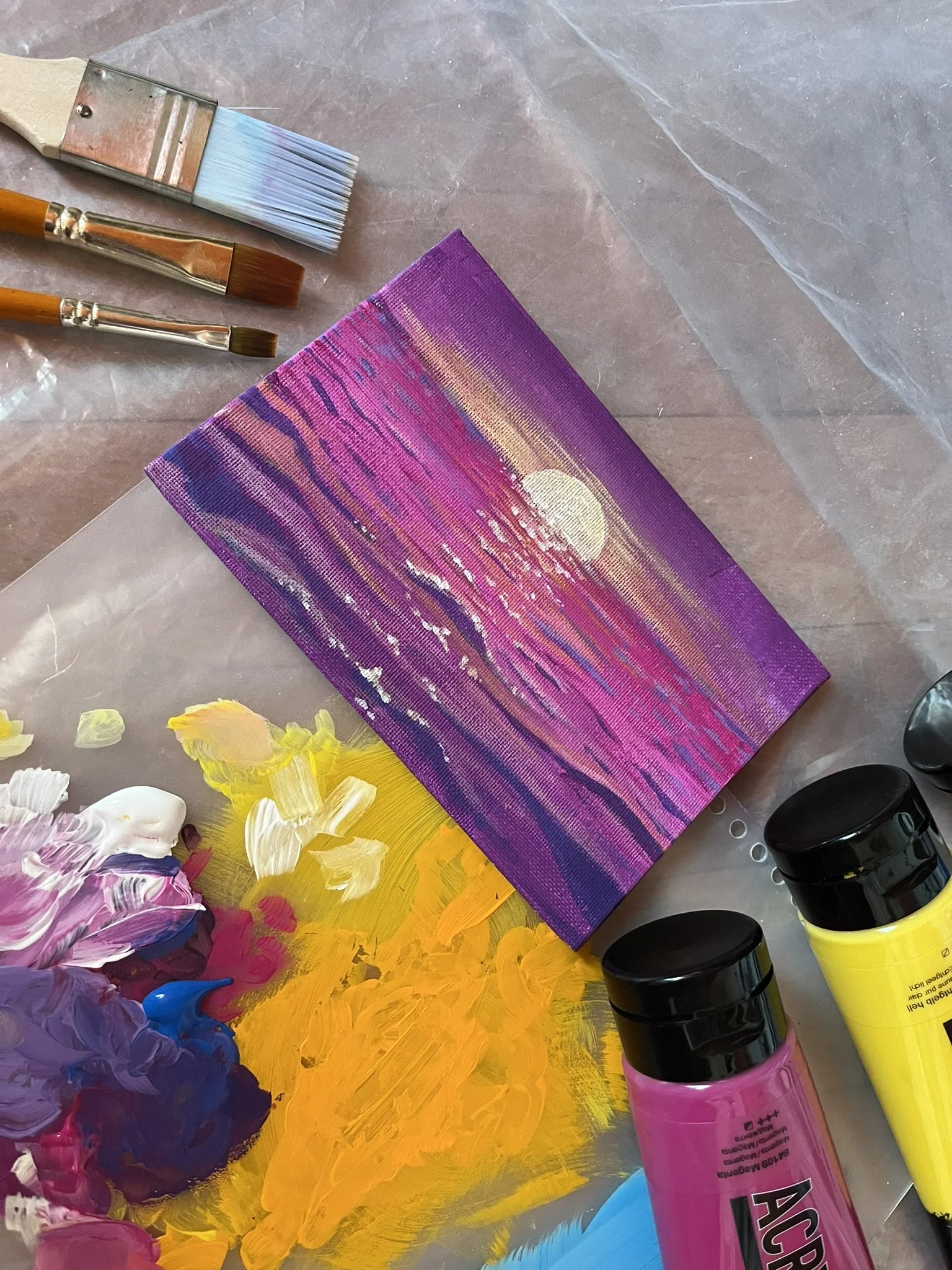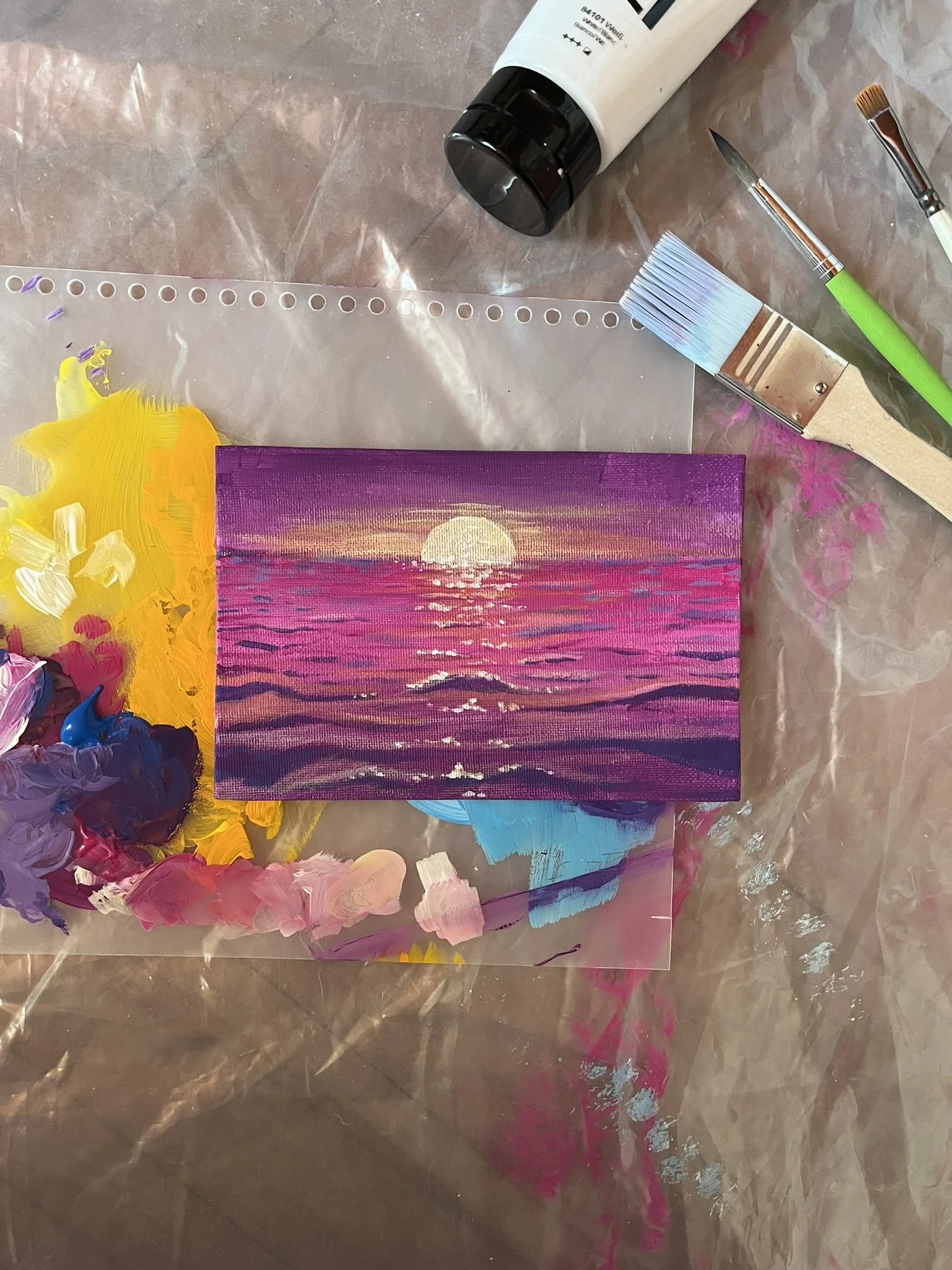 The Beach of My Dreams; Echoes from Celo, Alpha Centauri (2025), acrylic on a board, 13x18 cm.